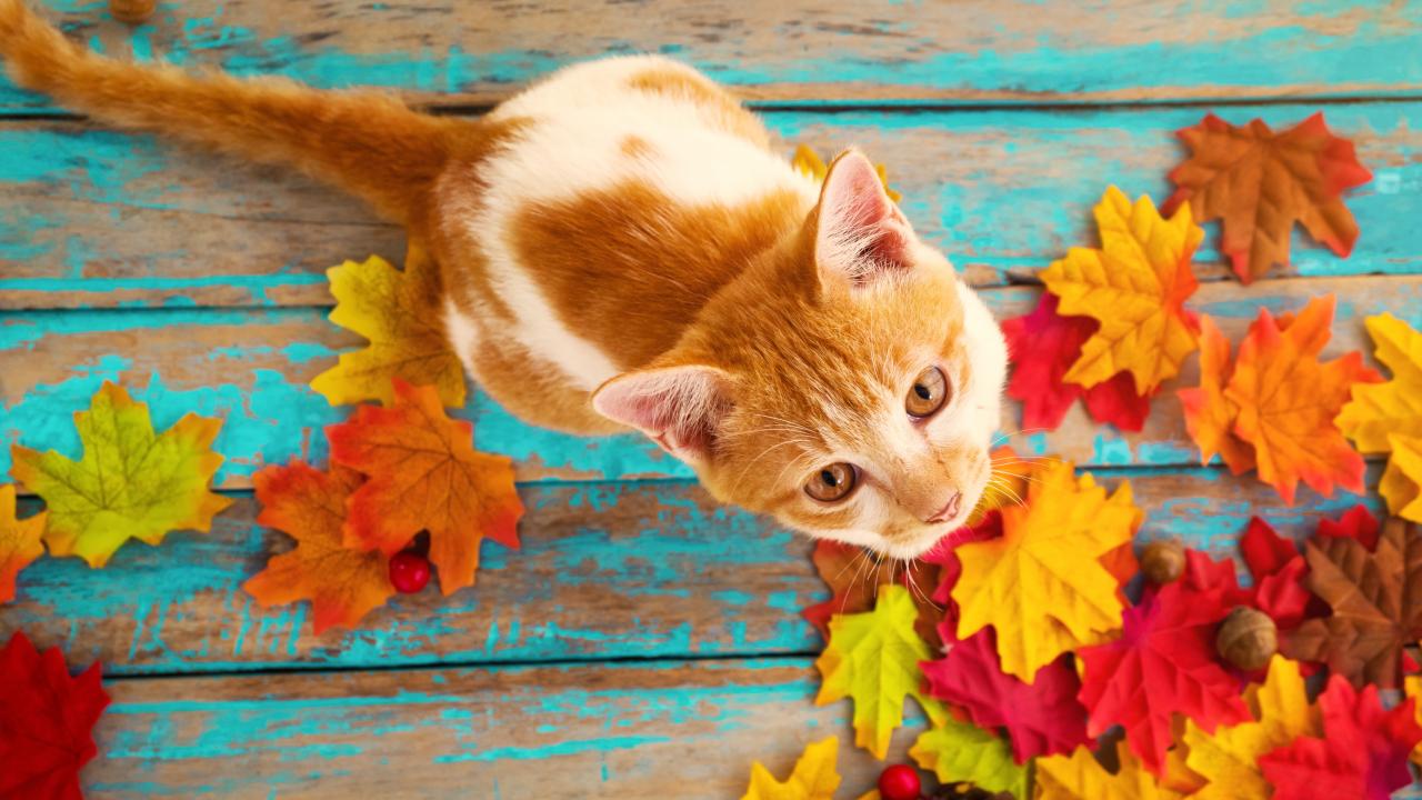 Обои Красивый рыжий кот на столе с опавшими листьями