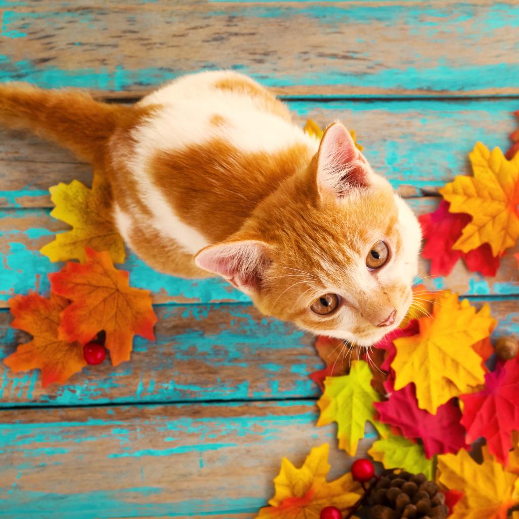 Обои Красивый рыжий кот на столе с опавшими листьями