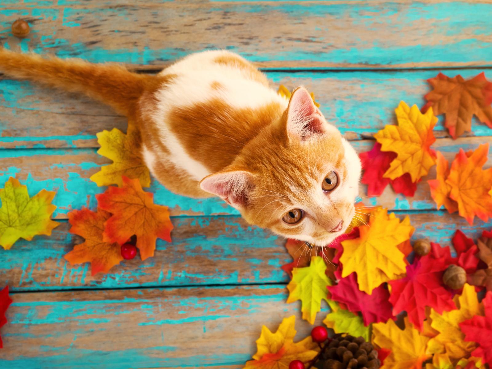 Обои Красивый рыжий кот на столе с опавшими листьями