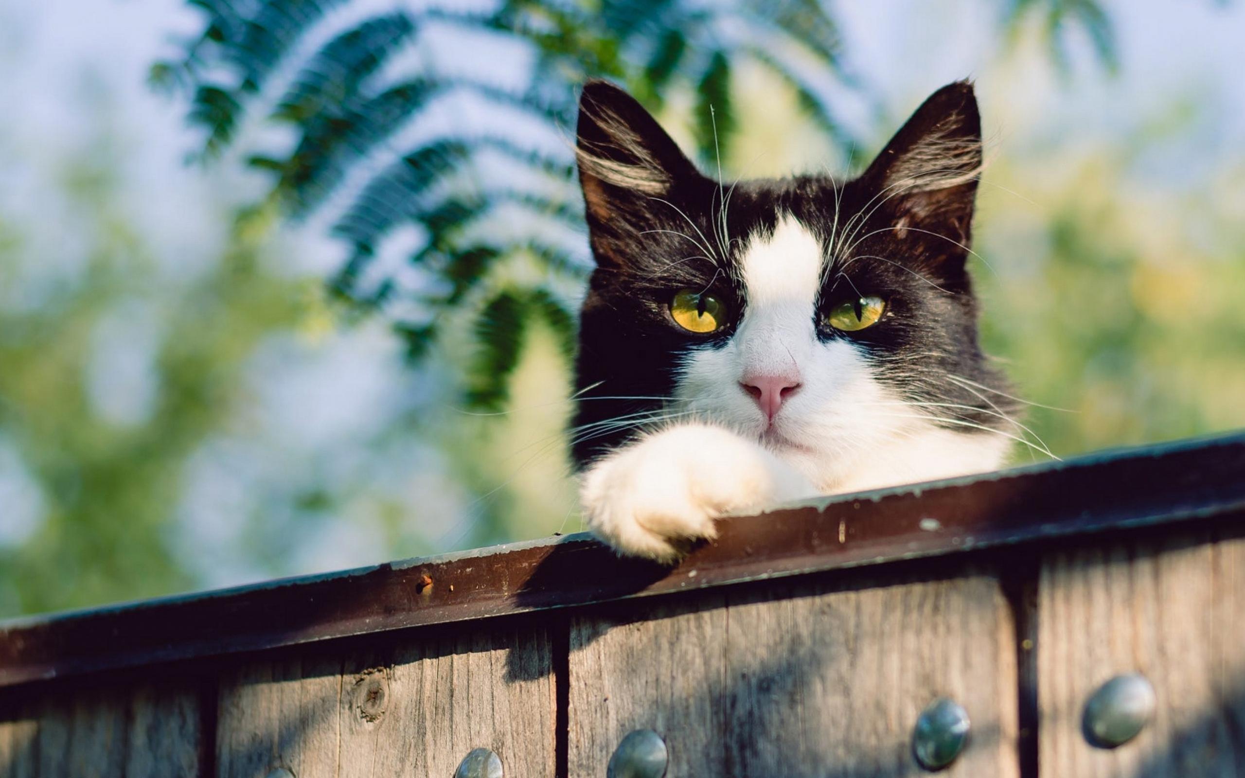 Обои Красивый черно белый кот с желтыми глазами на заборе