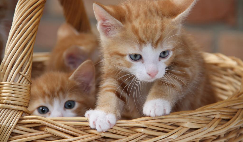 Обои Рыжие милые котята сидят в плетеной корзине