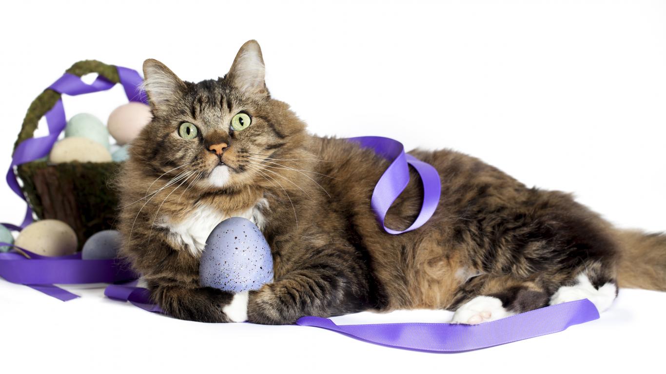 Обои Серый пушистый кот с пасхальными яйцами на белом фоне