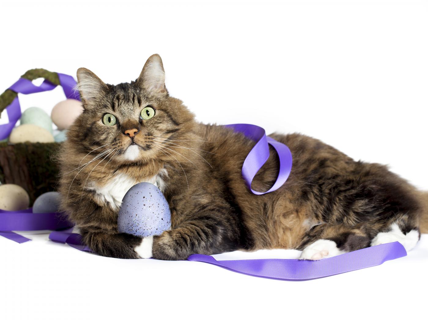 Обои Серый пушистый кот с пасхальными яйцами на белом фоне