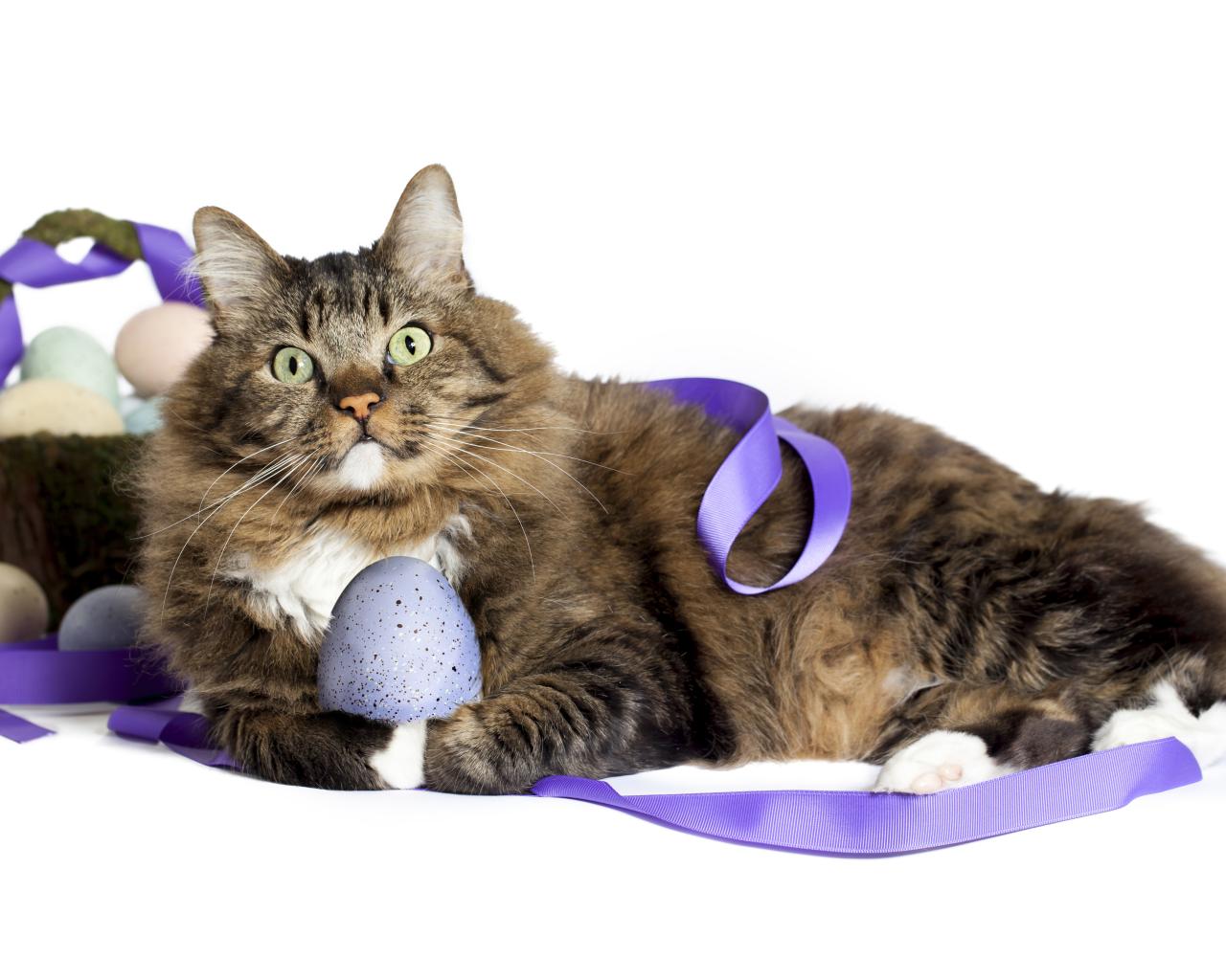 Обои Серый пушистый кот с пасхальными яйцами на белом фоне