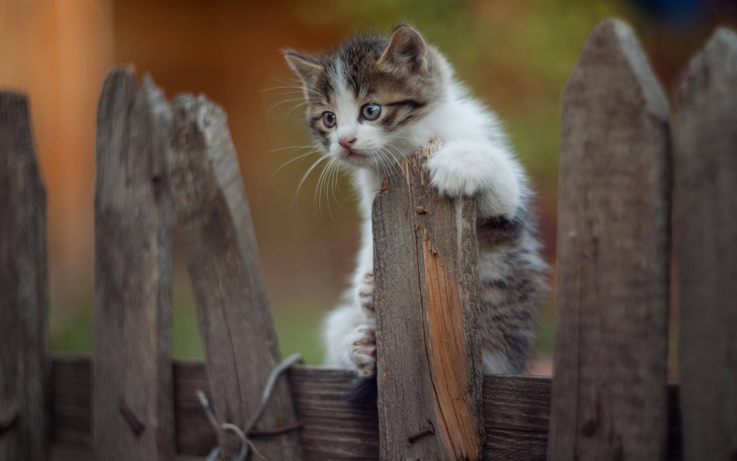Обои Маленький забавный котенок на заборе
