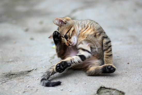 Обои Маленький серый котенок играет на асфальте