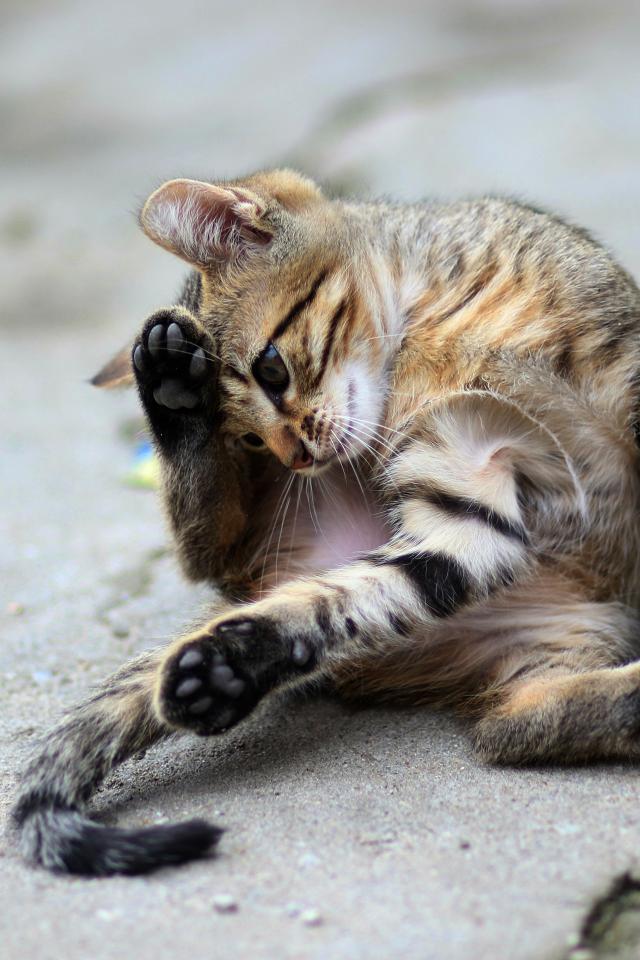 Обои Маленький серый котенок играет на асфальте