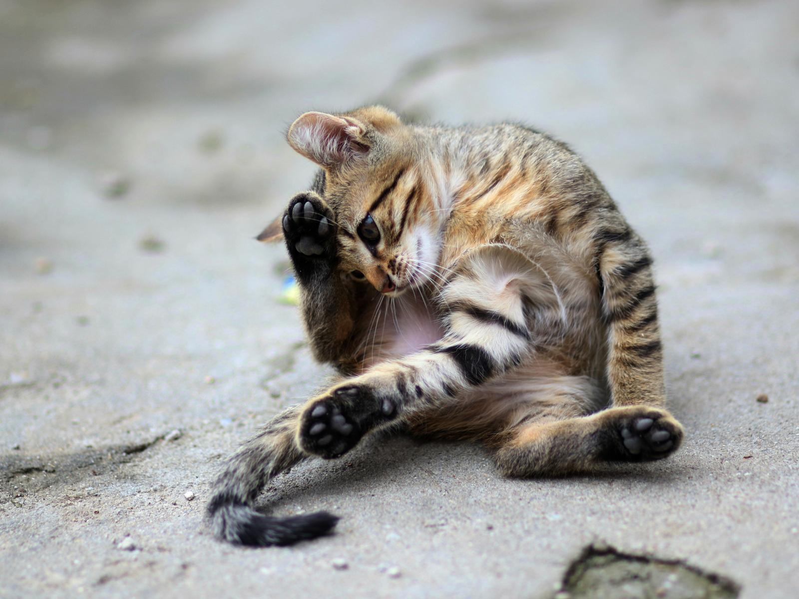 Обои Маленький серый котенок играет на асфальте