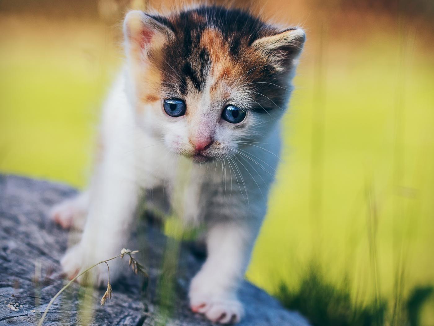 Обои Маленький милый трехцветный котенок на пне