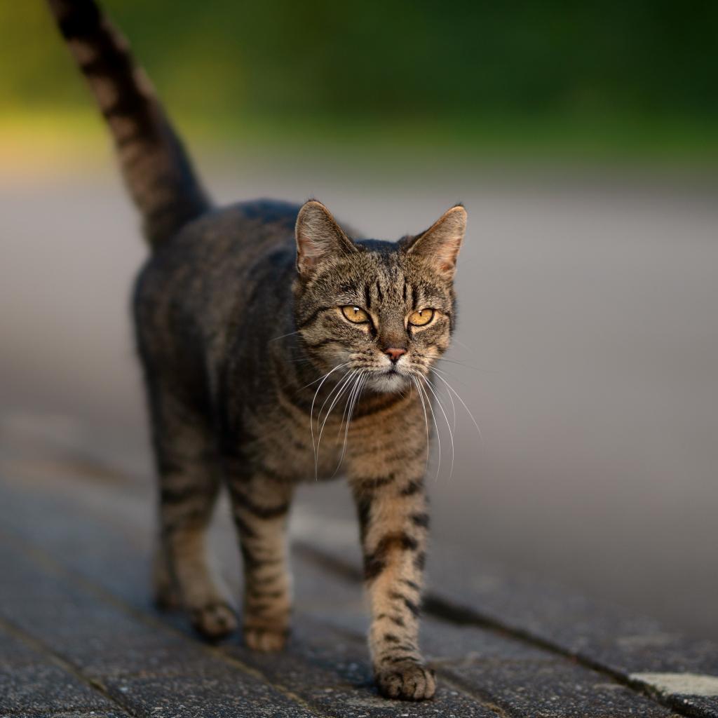 Обои Серая кошка с желтыми глазами идет по дороге