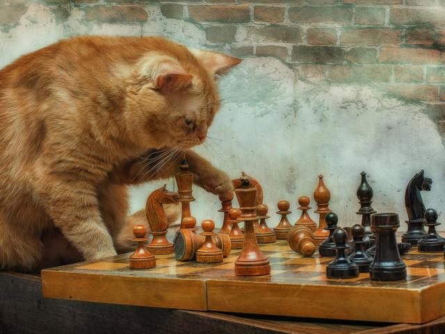 Обои Рыжий кот играет с деревянными шахматами у стены
