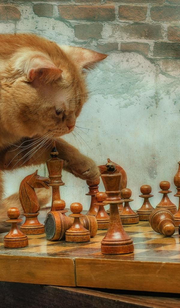 Обои Рыжий кот играет с деревянными шахматами у стены