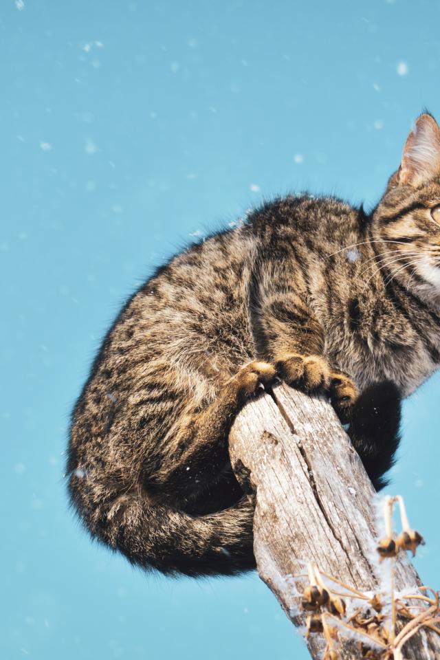 Обои Серый кот сидит на дереве на фоне голубого неба