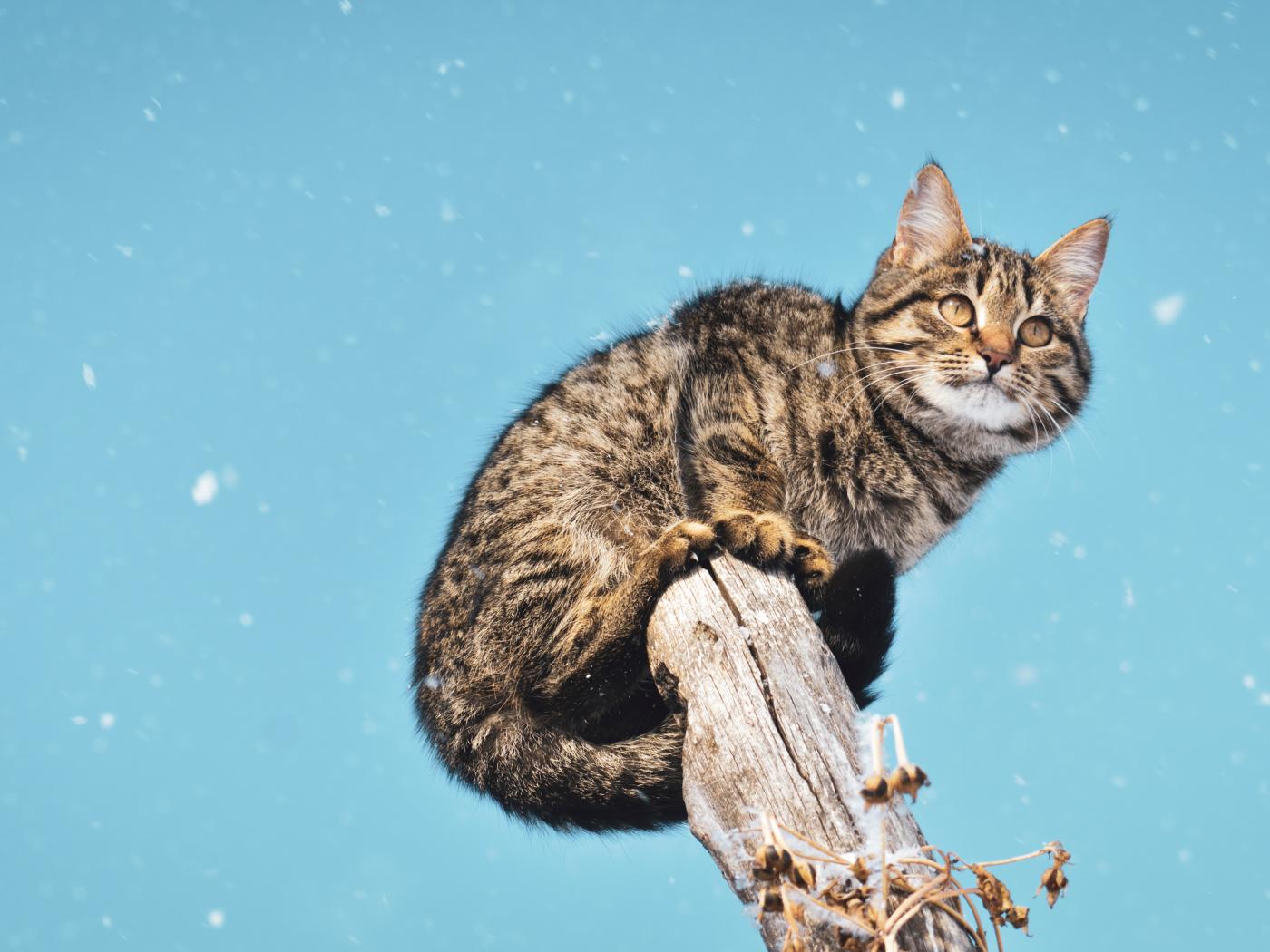 Обои Серый кот сидит на дереве на фоне голубого неба