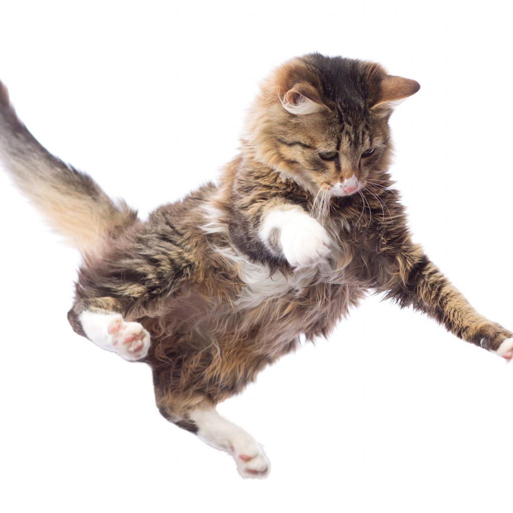 » Обои Прыжок серого кота на белом фоне
