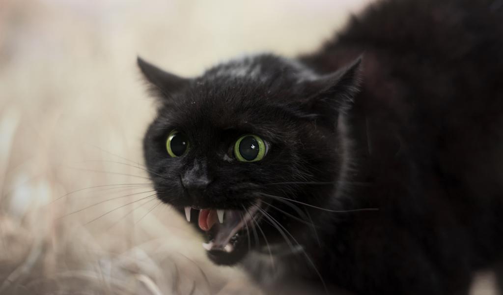 Обои Черный агрессивный кот с острыми клыками