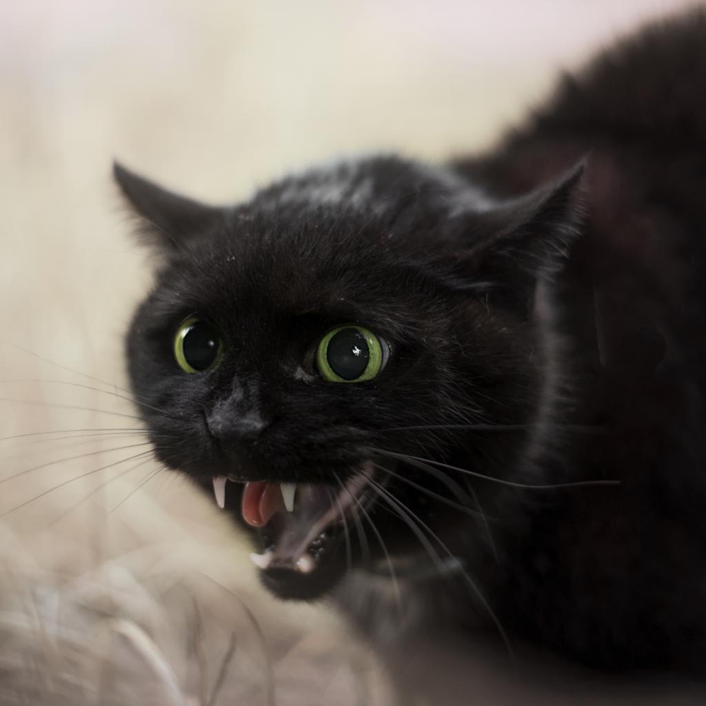 Обои Черный агрессивный кот с острыми клыками