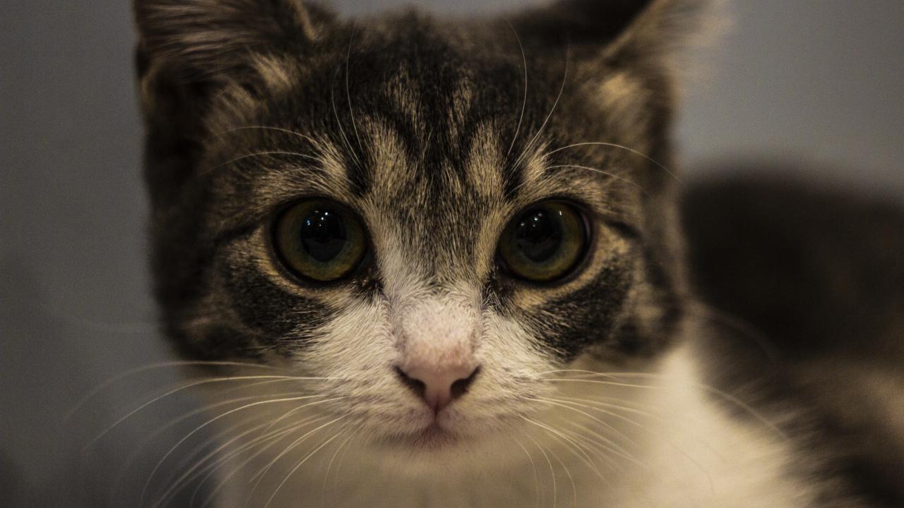 Обои Домашний серый с белым котенок крупным планом