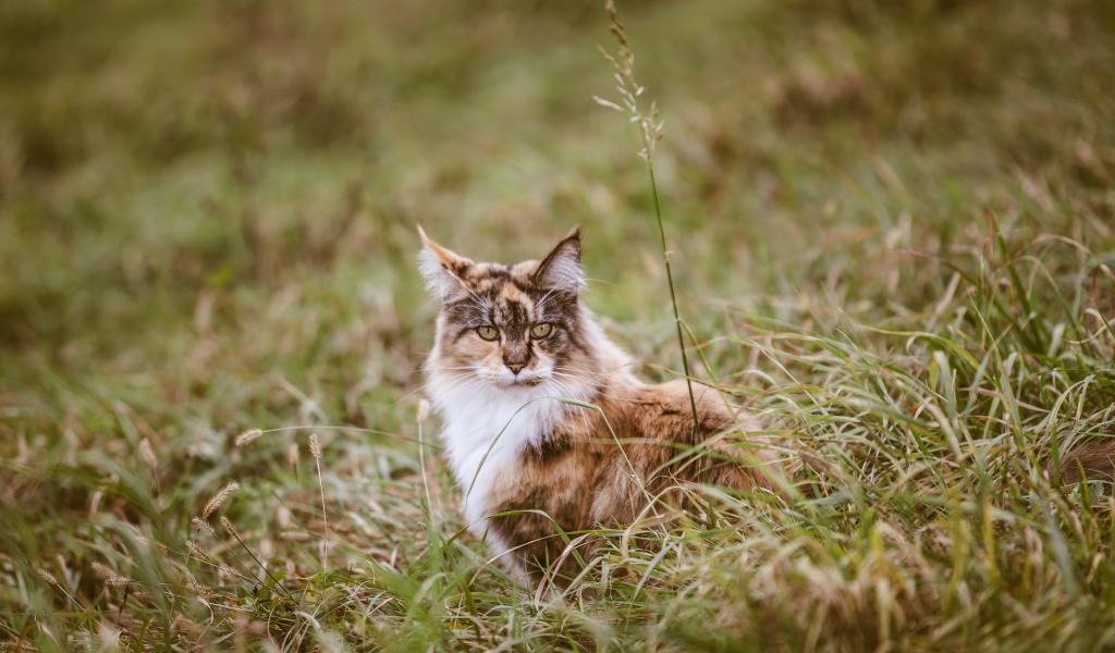 Обои Красивая трехцветная кошка сидит в зеленой траве