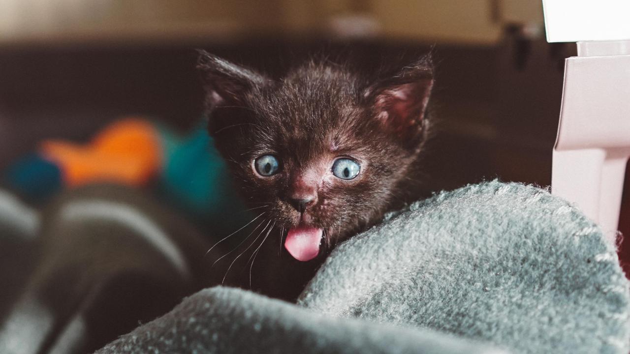 Обои Маленький черный котенок с высунутым языком на кровати