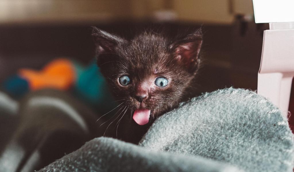 Обои Маленький черный котенок с высунутым языком на кровати