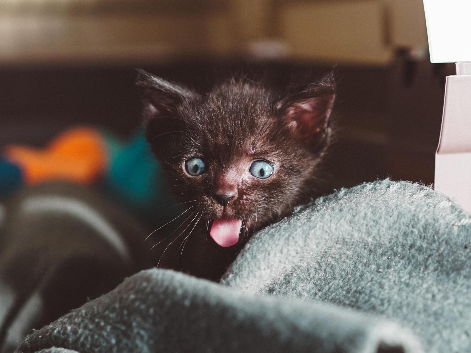 Обои Маленький черный котенок с высунутым языком на кровати
