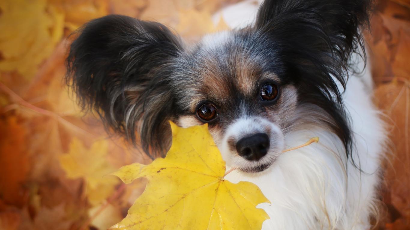 Обои Собака папильон с опавшим листом в зубах