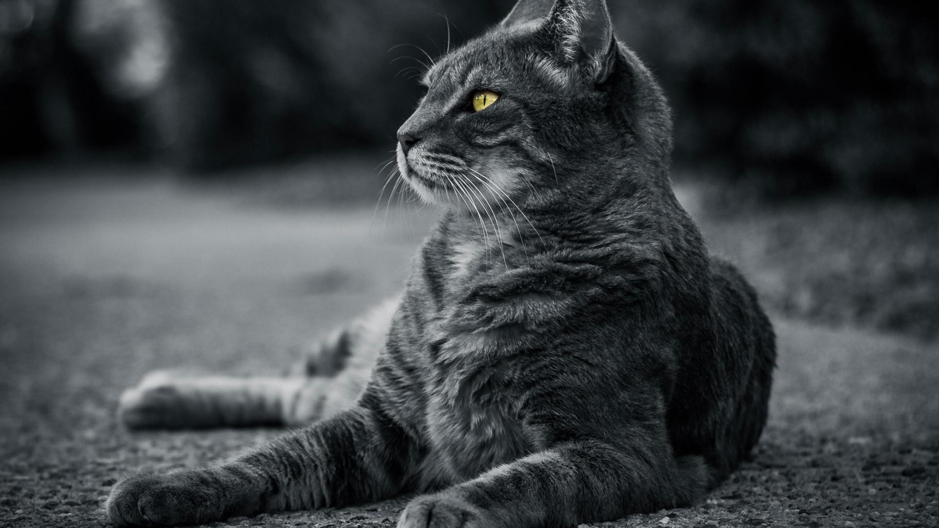 Обои Красивый серый кот с зелеными глазами лежит на асфальте