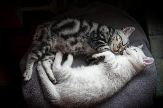 Обои Два милых породистых котенка спят на кровати