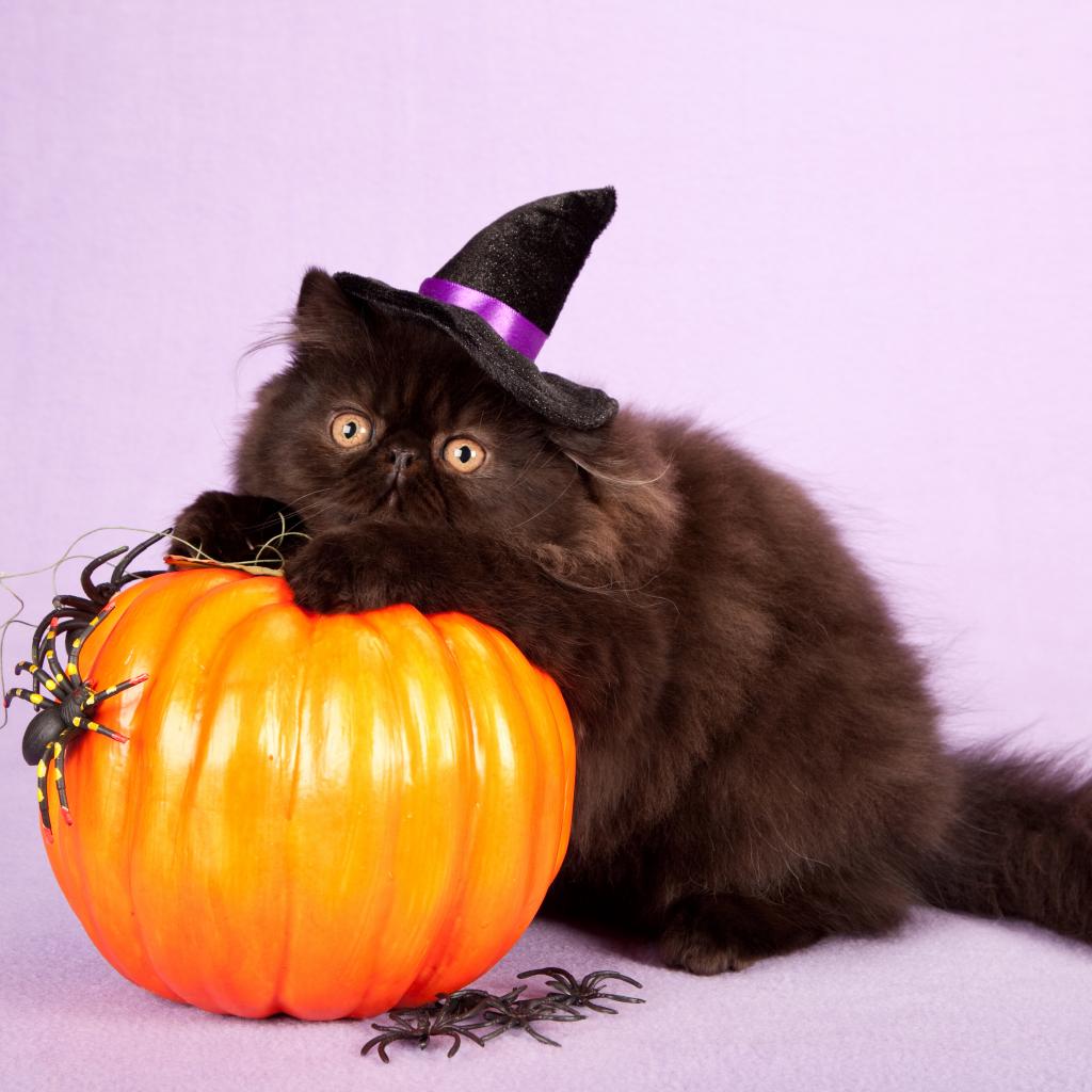 Обои Пушистый черный кот с тыквой на Хэллоуин