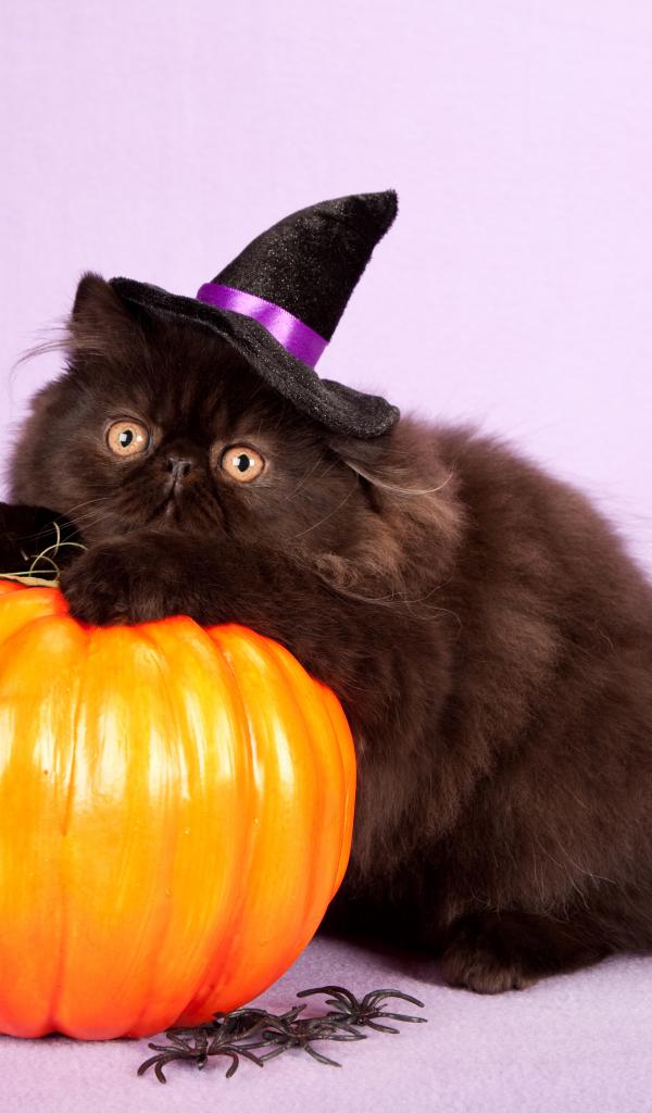Обои Пушистый черный кот с тыквой на Хэллоуин