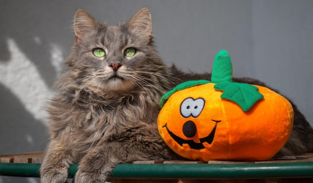 Обои Серый кот на лавке с игрушечной тыквой