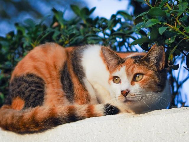 Обои Трехцветная кошка греется на солнце