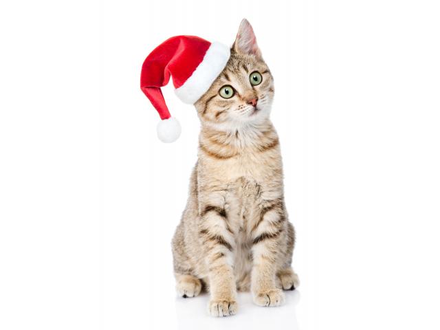 Обои Серый кот в колпаке Санта Клауса на белом фоне