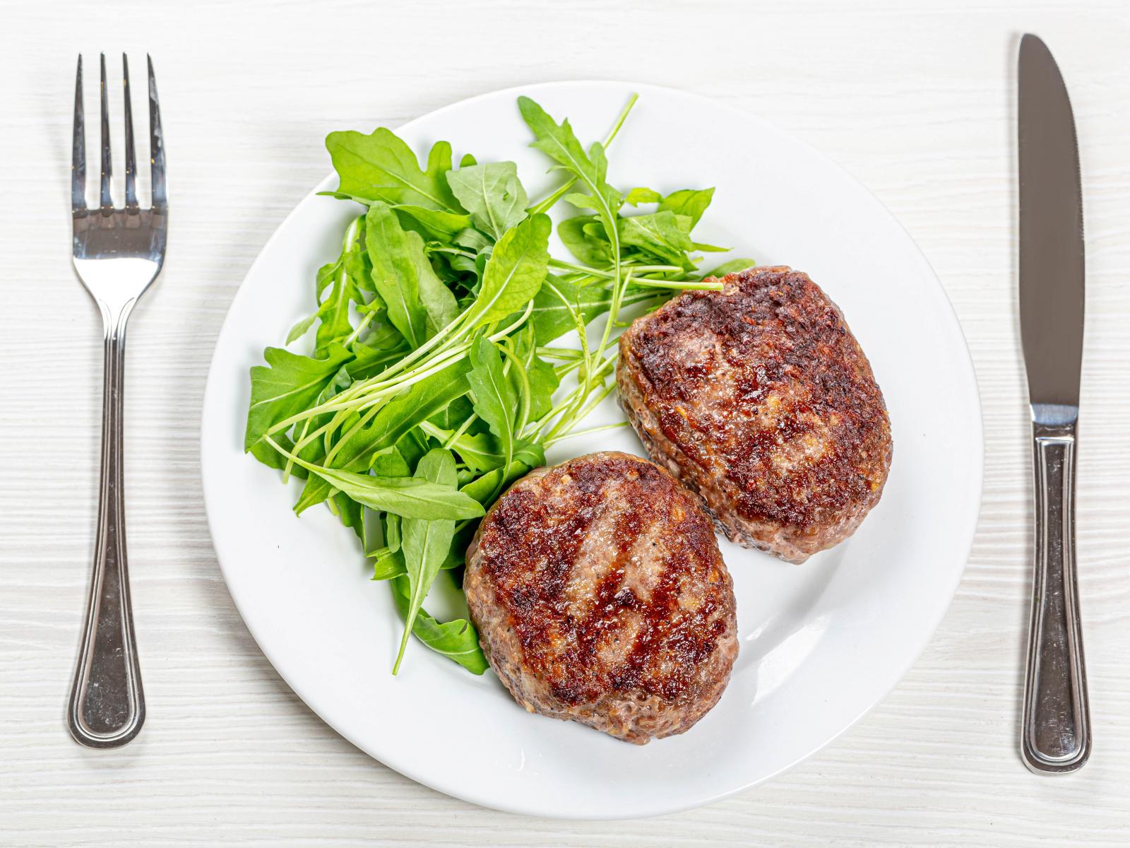 Обои Две котлеты на тарелке с зеленью рукколы