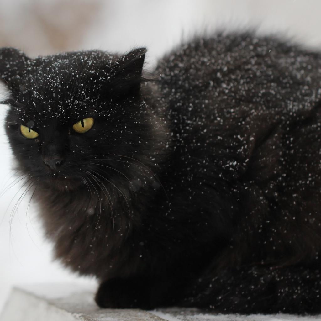 Обои Недовольный черный кот в снегу на улице