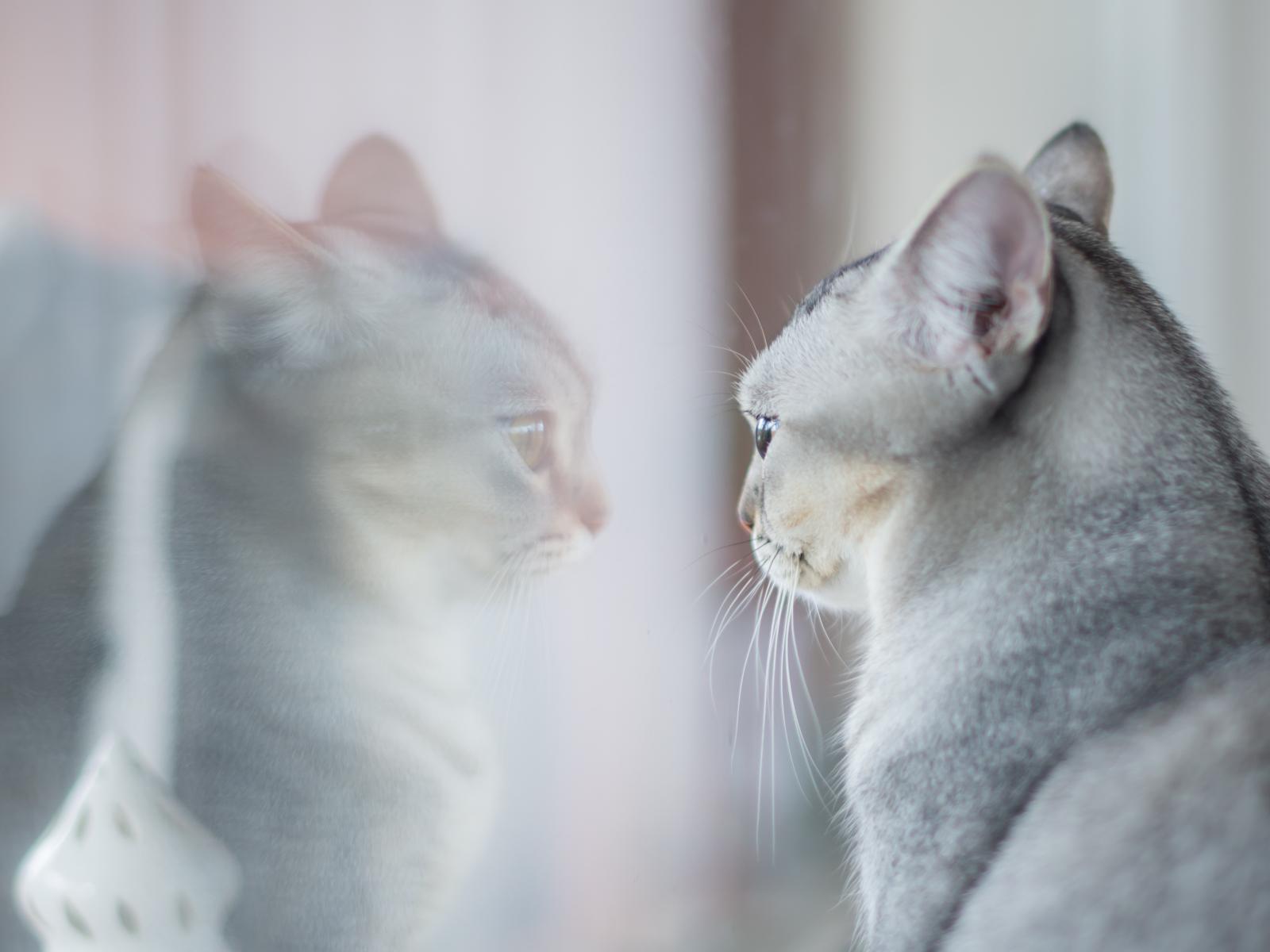 Обои Породистая серая кошка отражается в окне