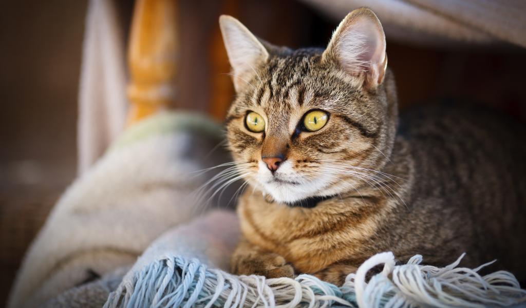 Обои Красивый серый кот с желтыми глазами лежит на одеяле