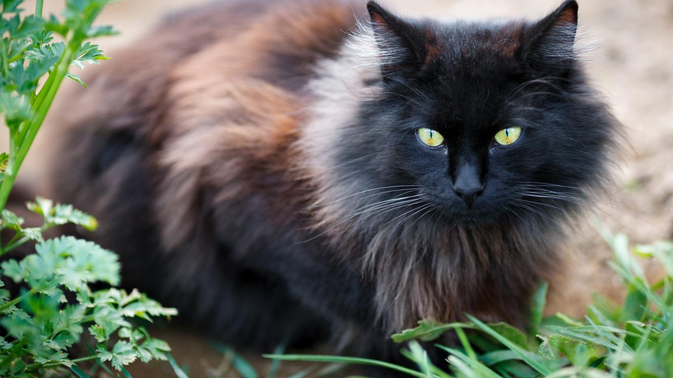 Обои Черный пушистый породистый кот сидит у зеленой травы