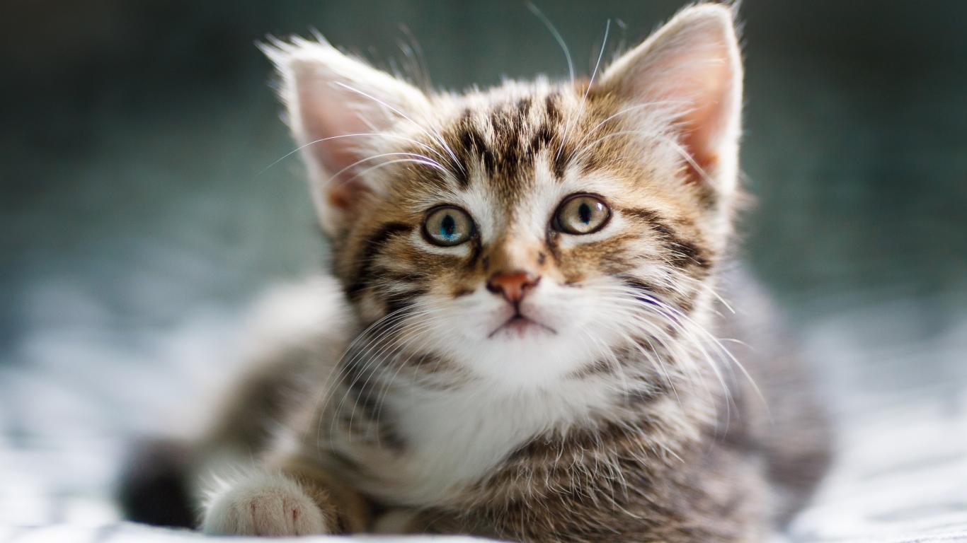 Обои Забавный серый котенок лежит на кровати