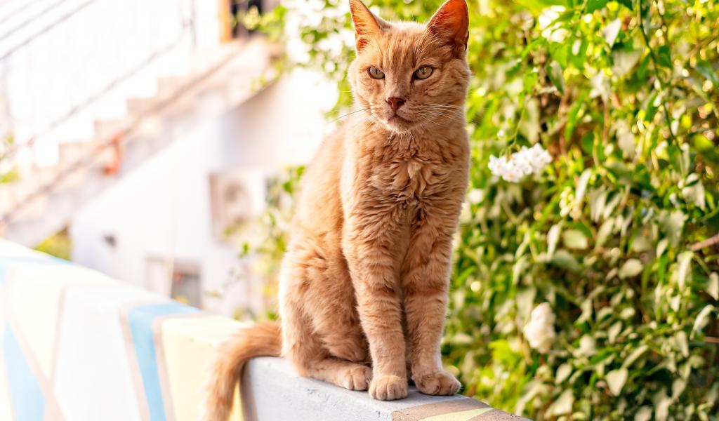 Обои Серьезный рыжий кот сидит на перилах