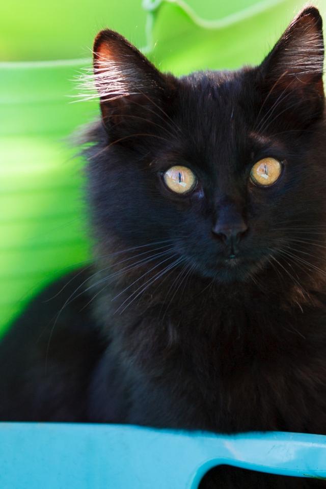 Обои Красивый пушистый черный кот с желтыми глазами
