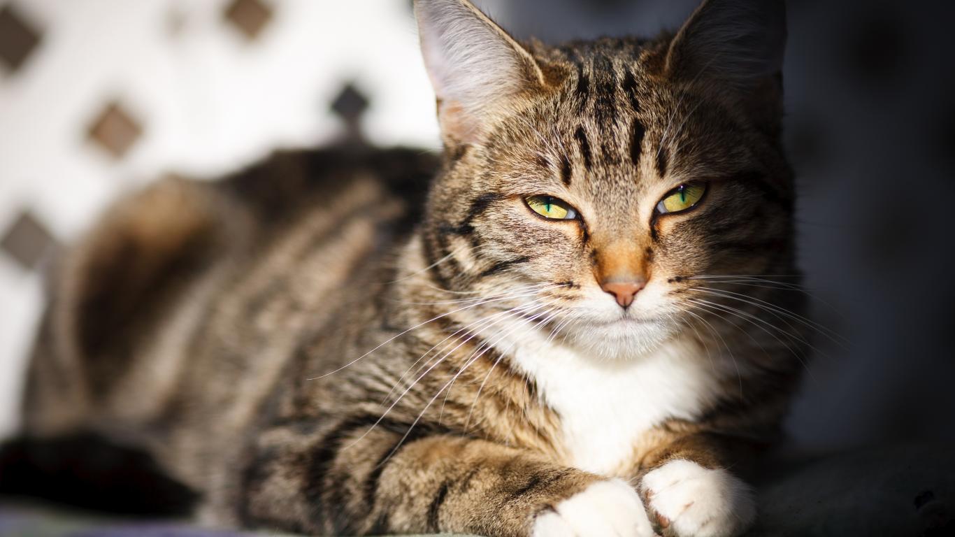 Обои Довольный серый кот в лучах солнца