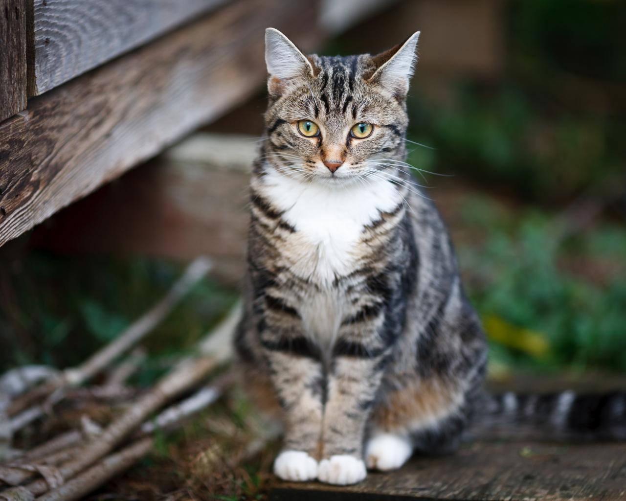 Обои Задумчивый серый кот сидит на деревянной лавке