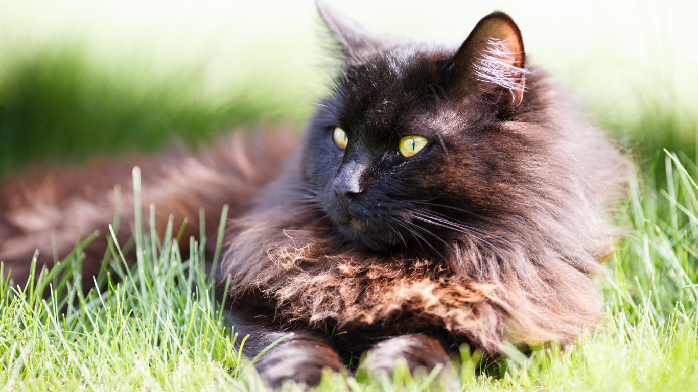 Обои Пушистый черный кот лежит на зеленой траве