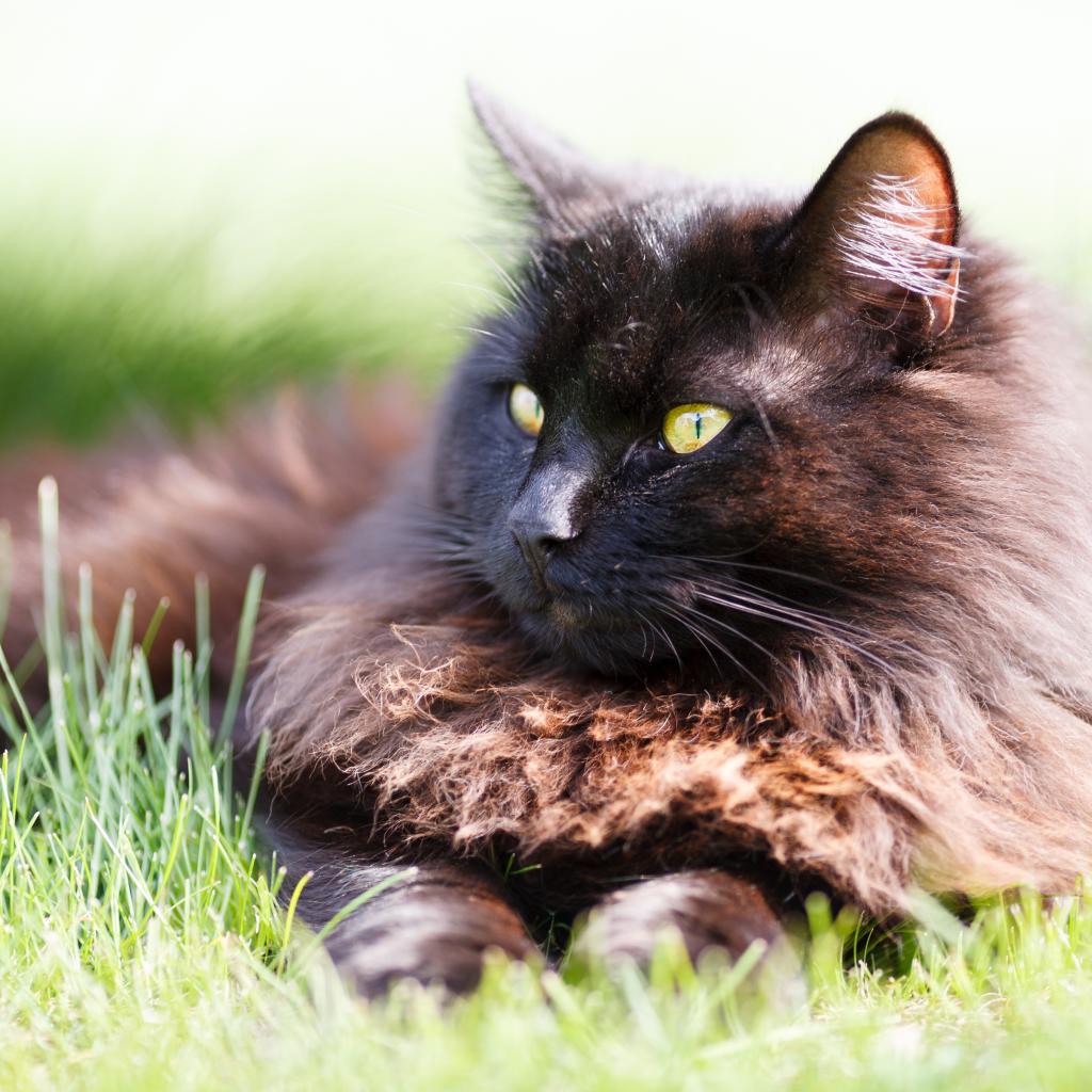 Обои Пушистый черный кот лежит на зеленой траве