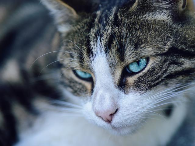 Обои Морда серой кошки с голубыми глазами