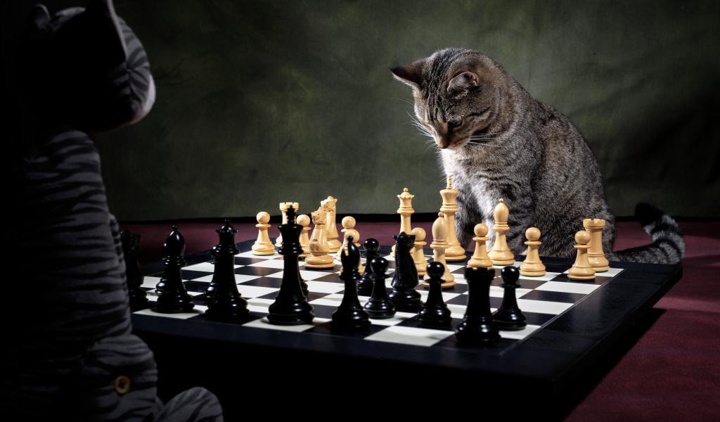 Обои Серый кот играет в шахматы