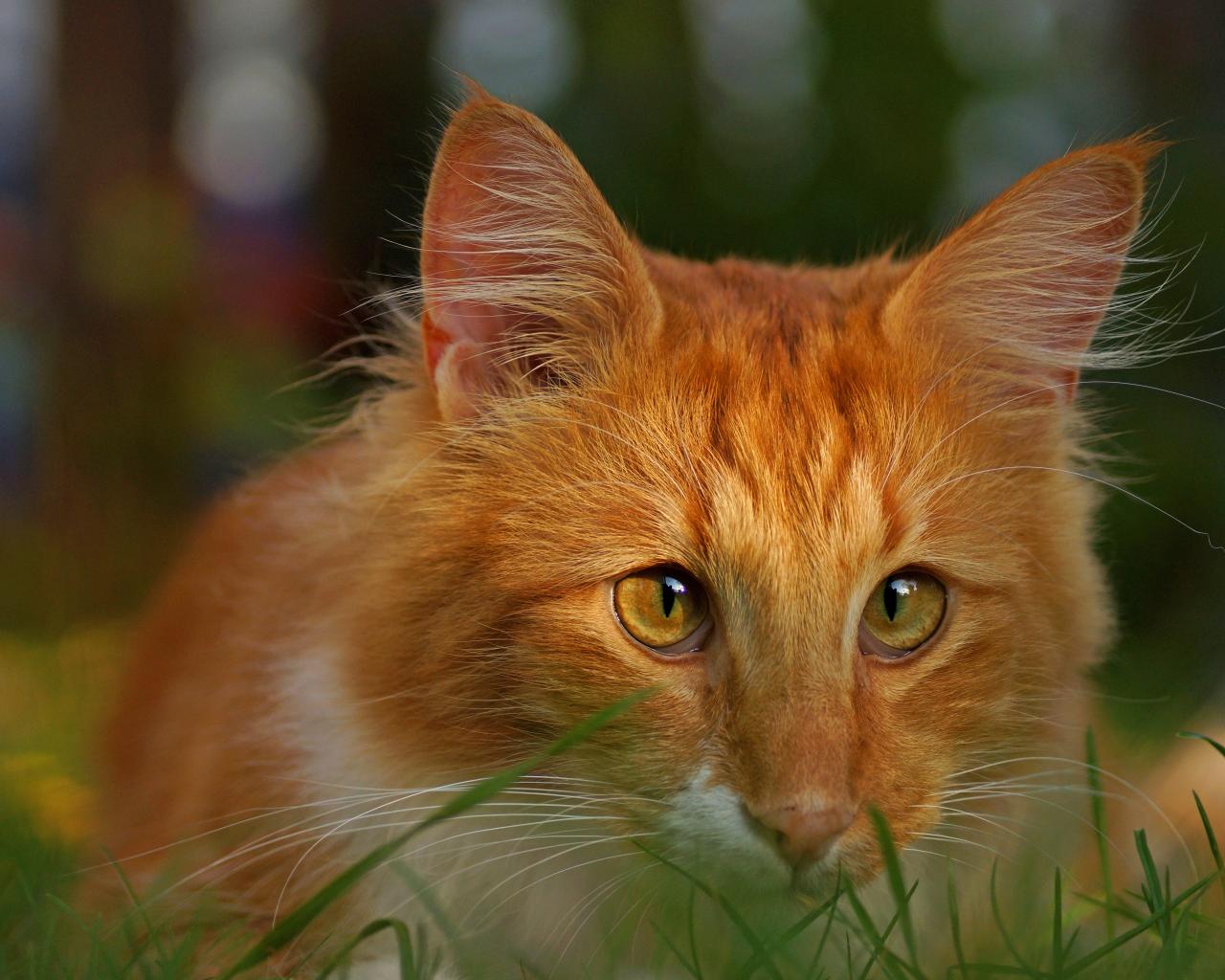 Обои Рыжий кот со смешными глазами сидит в зеленой траве