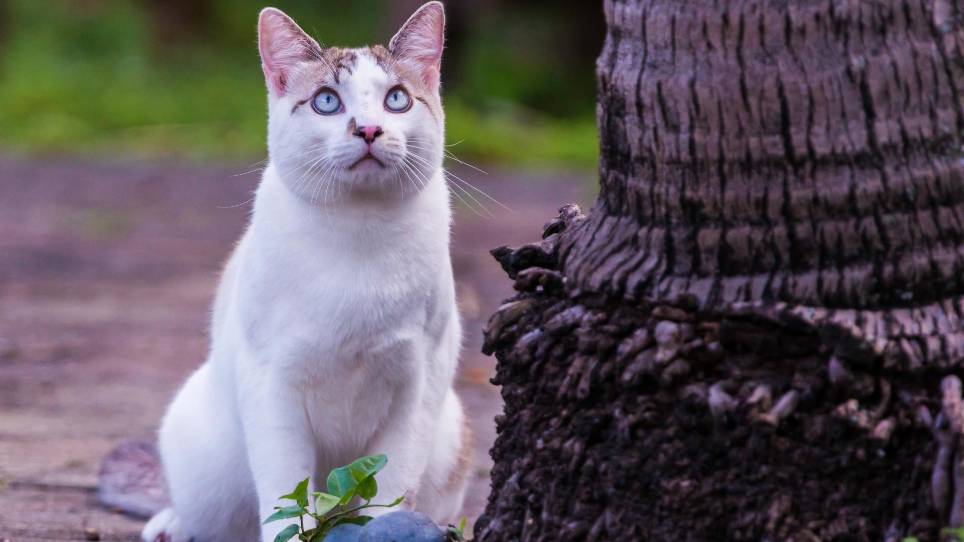 Обои Красивый белый голубоглазый кот сидит у дерева